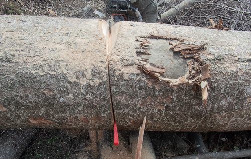伐倒した檜を解体している時に、私は誤って石を切ってしまったのです。